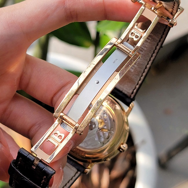 Dây da cá sấu màu nâu thủ công, khóa cài bằng vàng 18K đồng bộ với vỏ.