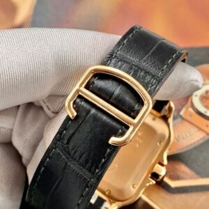Cartier WGSA0019 đi kèm dây đeo da cá sấu màu nâu, giúp tăng thêm vẻ quý phái và tạo cảm giác thoải mái khi đeo. Khóa gập bằng vàng hồng 18K giúp cố định chắc chắn và dễ dàng điều chỉnh.