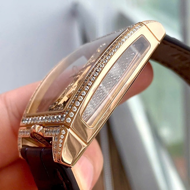 Vỏ vàng hồng 18K, hình tonneau (thùng rượu) đặc trưng của dòng Golden Bridge, kích thước 34 x 51mm – vừa thanh lịch, vừa nổi bật.