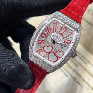 Franck Muller Lady Heart gây ấn tượng mạnh với thiết kế vỏ tonneau đặc trưng – dáng vỏ cong mềm mại ôm trọn cổ tay. Đây là kiểu dáng đã làm nên tên tuổi của Franck Muller trong giới haute horlogerie. Phần mặt số nổi bật với họa tiết trái tim được thiết kế tinh tế, thường kết hợp cùng những viên kim cương lấp lánh hoặc chi tiết guilloché thủ công, tạo hiệu ứng ánh sáng sang trọng và cuốn hút.