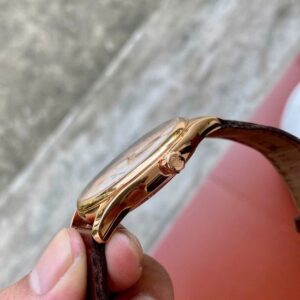 Vỏ đồng hồ được chế tác từ thép không gỉ mạ vàng hồng PVD sang trọng, kết hợp cùng dây da nâu cao cấp, mang lại sự thoải mái và phong cách quý phái. Kính sapphire chống trầy xước giúp bảo vệ mặt số luôn trong tình trạng hoàn hảo.