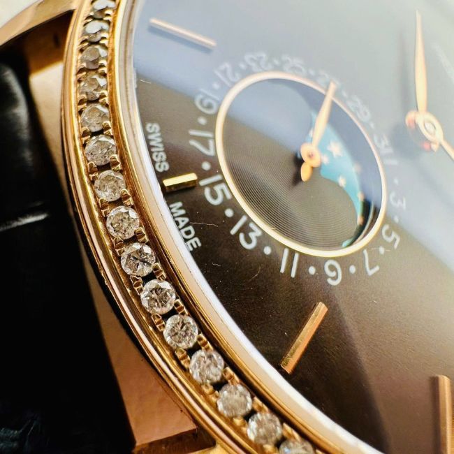 Nổi bật trên nền mặt số trắng ngà tinh tế là bộ kim lá thanh mảnh, cọc số dạng vạch gọn gàng, cùng ô hiển thị lịch tuần trăng (Moonphase) nằm ở vị trí 6 giờ – một chi tiết mang đậm chất cổ điển và lãng mạn.