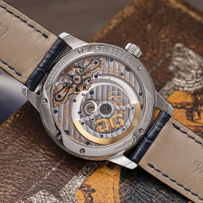 Mặt sau lộ cơ hoàn toàn, cho phép chiêm ngưỡng cầu máy mạ rhodium, vân Glashütte sọc đôi, ốc nung xanh, chân kính hồng – những đặc điểm nhận diện của đồng hồ Đức cao cấp.