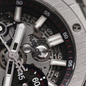 Chiếc đồng hồ được trang bị bộ vỏ và dây đeo bằng titanium 42 mm – chất liệu nổi bật nhờ độ bền cao, trọng lượng nhẹ và khả năng chống ăn mòn tốt. Điều này giúp Hublot 451.NX.1170.NX vừa chắc chắn, vừa thoải mái khi đeo cả ngày dài. Vành bezel titanium cố định và lớp hoàn thiện satin kết hợp đánh bóng tăng thêm sự tinh tế cho tổng thể thiết kế.