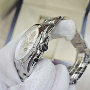 Mặt số đồng hồ được thiết kế với màu trắng bạc, cùng với cọc số La Mã và kim chỉ màu xanh dương tinh tế, mang đến sự tương phản nhẹ nhàng nhưng đầy cuốn hút. Lịch ngày được bố trí tại vị trí 3 giờ, giúp người đeo dễ dàng theo dõi lịch trình hàng ngày.