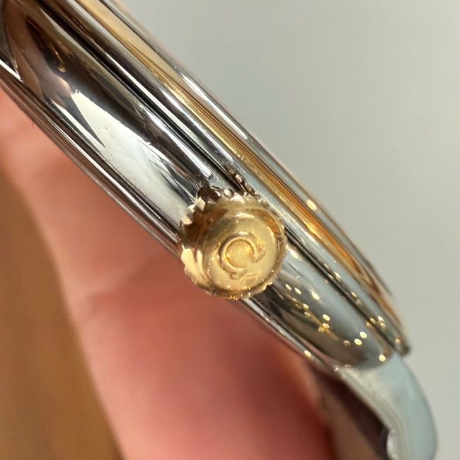 Omega 4720.21.01 gây ấn tượng với vỏ tròn bằng vàng vàng 18K, đường kính nhỏ gọn ~24mm (dành cho nữ), phù hợp với cổ tay thanh mảnh. Mặt số khảm trai trắng, kết hợp cọc số La Mã và kim chỉ giờ mảnh mai, tạo nên vẻ ngoài nhẹ nhàng và quý phái.