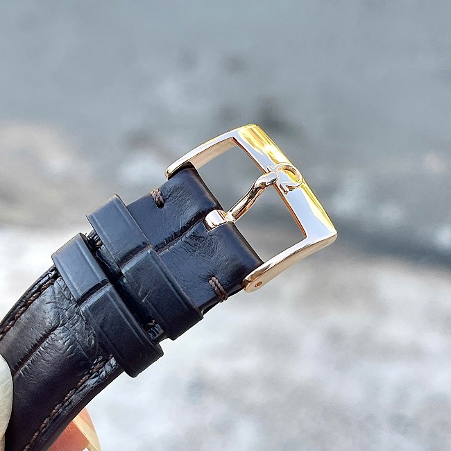 Mặt số đồng hồ màu bạc ánh kim với bố cục đơn giản nhưng hài hòa. Các cọc số La Mã kết hợp với kim đồng hồ dạng dauphine sắc sảo, mang lại vẻ đẹp cổ điển mà vẫn hiện đại. - Bố cục chức năng cân đối: