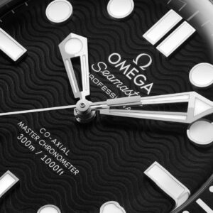 Mặt số đen của đồng hồ được trang trí họa tiết sóng laser đặc trưng – một dấu ấn mang tính biểu tượng của dòng Seamaster. Các cọc số dạng chấm tròn và hình học được phủ dạ quang Super-LumiNova, kết hợp cùng bộ kim skeleton giúp tăng khả năng quan sát trong điều kiện thiếu sáng hoặc dưới nước. Ô lịch ngày được đặt gọn gàng tại vị trí 6 giờ, tạo sự cân đối cho tổng thể mặt số.