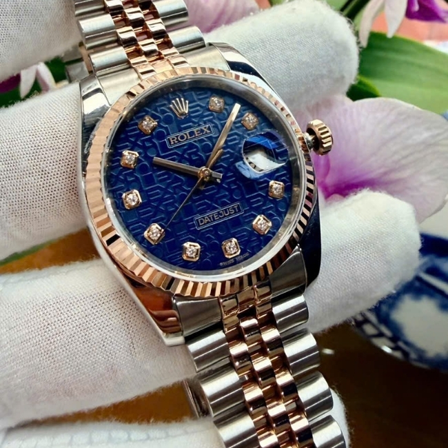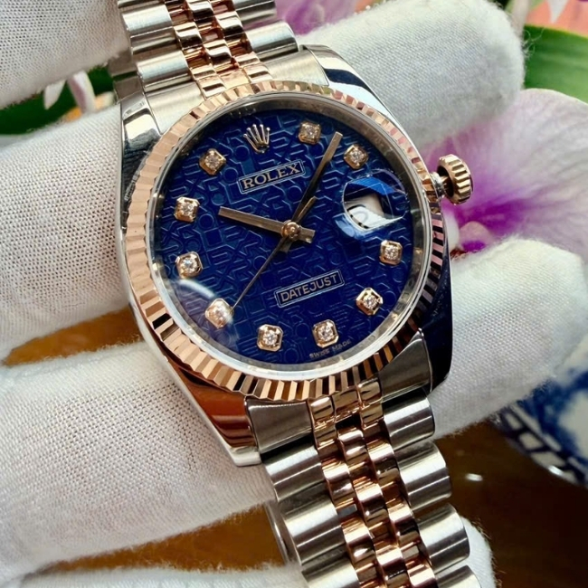 Điểm nhấn nổi bật của Rolex Datejust 116231 Diamonds nằm ở thiết kế hai tông màu đặc trưng Rolesor (thép và vàng hồng), mang lại vẻ ngoài vừa hiện đại vừa cổ điển. Vành bezel nạm kim cương lấp lánh giúp tổng thể chiếc đồng hồ trở nên đẳng cấp và thu hút mọi ánh nhìn. Kích thước 36mm lý tưởng cho cổ tay nam giới châu Á hoặc những ai yêu thích phong cách thanh lịch, gọn gàng.