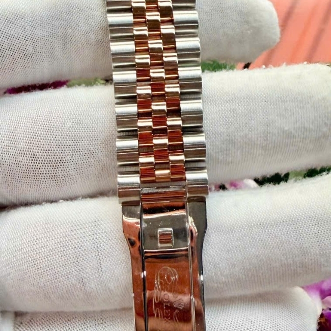 Dây đeo Jubilee hoặc Oyster với sự kết hợp giữa thép và vàng hồng mang lại cảm giác đeo thoải mái và sang trọng. Khóa gập Oysterclasp chắc chắn giúp đảm bảo an toàn khi sử dụng, đồng thời giữ được sự liền mạch trong thiết kế tổng thể.