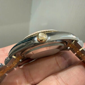 Rolex Datejust demi vàng nổi bật với mặt số đa dạng như champagne, trắng, đen, xà cừ hoặc đính kim cương, kết hợp cùng hiệu ứng chải tia sunburst bắt sáng ấn tượng. Ô lịch ngày tại vị trí 3 giờ với kính Cyclops phóng đại đặc trưng giúp tăng tính nhận diện và tiện dụng. Vành bezel có thể là vành trơn thanh lịch hoặc vành khía fluted bằng vàng 18k – chi tiết mang tính biểu tượng của Datejust.