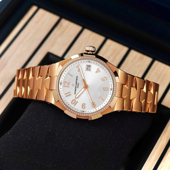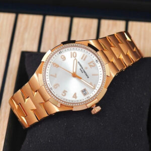 Vacheron Constantin 47560/D10R‑9672 sở hữu bộ vỏ vàng hồng 18K quý phái kết hợp cùng vành bezel đính kim cương lấp lánh, tạo nên tổng thể đầy cuốn hút. Kích thước mặt số 36mm vừa vặn với cổ tay nữ giới, mang lại cảm giác đeo thoải mái nhưng vẫn nổi bật. Mặt số tông sáng trang nhã, cọc số và kim hiển thị được hoàn thiện tỉ mỉ giúp khả năng quan sát rõ ràng trong nhiều điều kiện ánh sáng khác nhau. Từng chi tiết nhỏ đều được chăm chút kỹ lưỡng, thể hiện đẳng cấp chế tác đỉnh cao của một thương hiệu haute horlogerie.