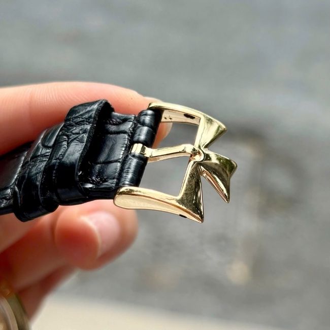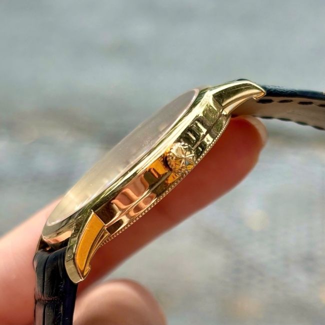Thiết kế tròn cổ điển, mỏng tinh tế chỉ hơn 8mm, cùng mặt số trắng ngà với kim Dauphine và cọc số vàng, thể hiện đúng tinh thần “Elegant Simplicity” – sự tối giản đạt đến mức hoàn mỹ.